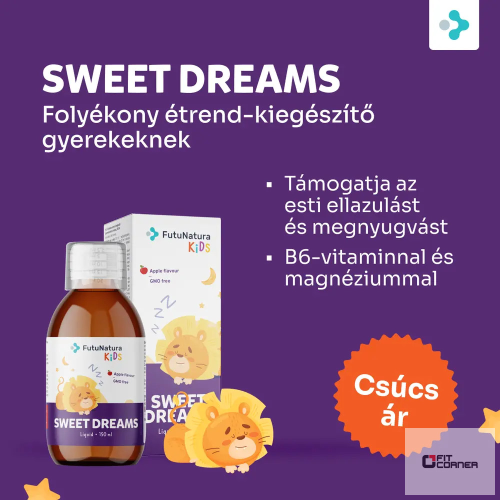 o A SWEET DREAMS – Folyékony étrend-kiegészítő gyerekeknek az alváshoz kellemes alma ízű, aminek a gyerekek biztosan nem fognak tudni ellenállni.