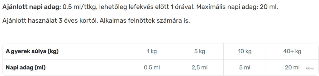 Ajánlott napi adag: 0,5 ml/ttkg, lehetőleg lefekvés előtt 1 órával. Maximális napi adag: 20 ml.