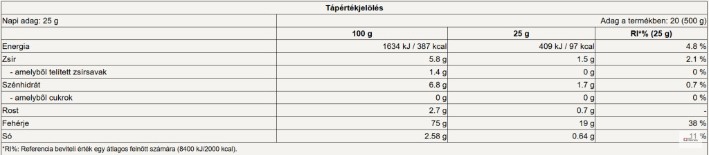 Összetevők: Borsófehérje izolátum, barna rizs fehérje, zsírszegény kakaópor, aromák, étkezési só, édesítőszerek (aceszulfám-K, szukralóz), sűrítőanyag (xantángumi), tökmag fehérjekészítmény por